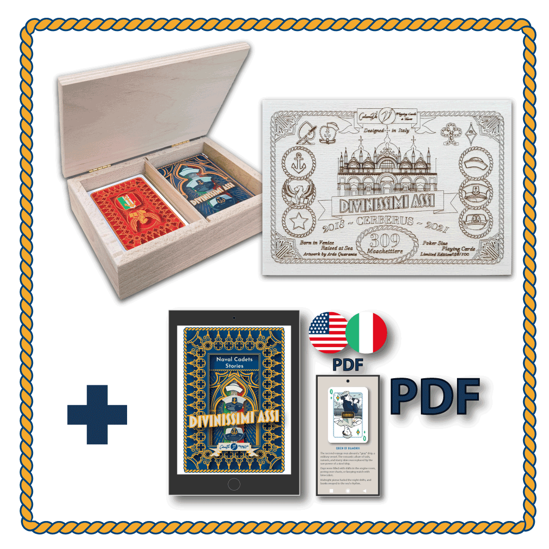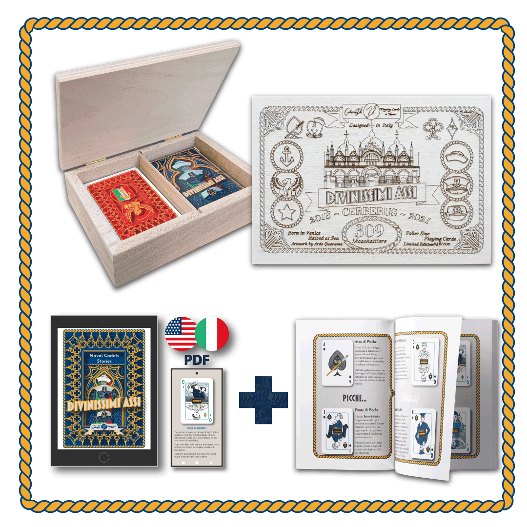 2 Mazzi (1 Blu e 1 Rosso) + Cofanetto in legno + Libretto "Divinnissimi Assi" (formato PDF, 60 pagine)